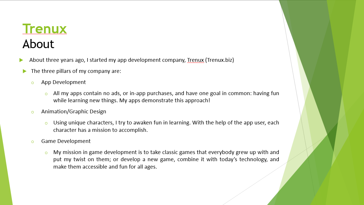 Thank you for your interest in my company and services. You can view the detailed information, my vision, and my needs by starting the slideshow below or downloading it as a PDF.